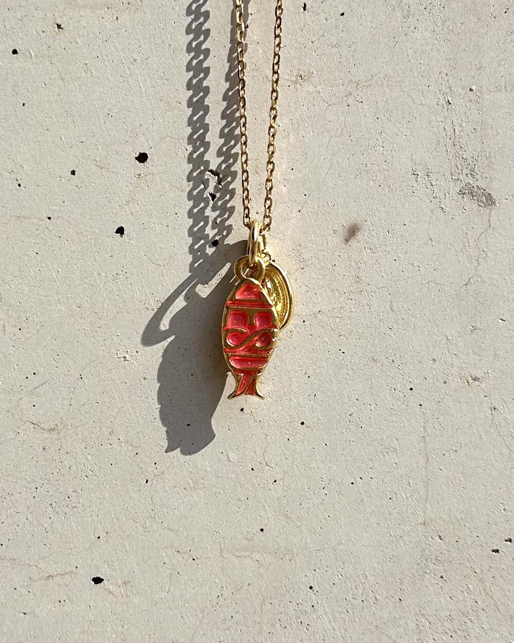 A lovely fish pendant layered with a round tulip pendant, creating a unique and charming small design.