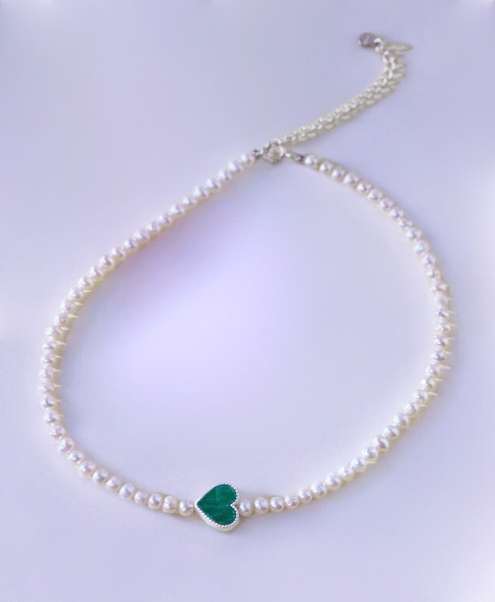 Part of the Pearl Series, this necklace features a green heart pendant combined with faux pearls for a charming design.