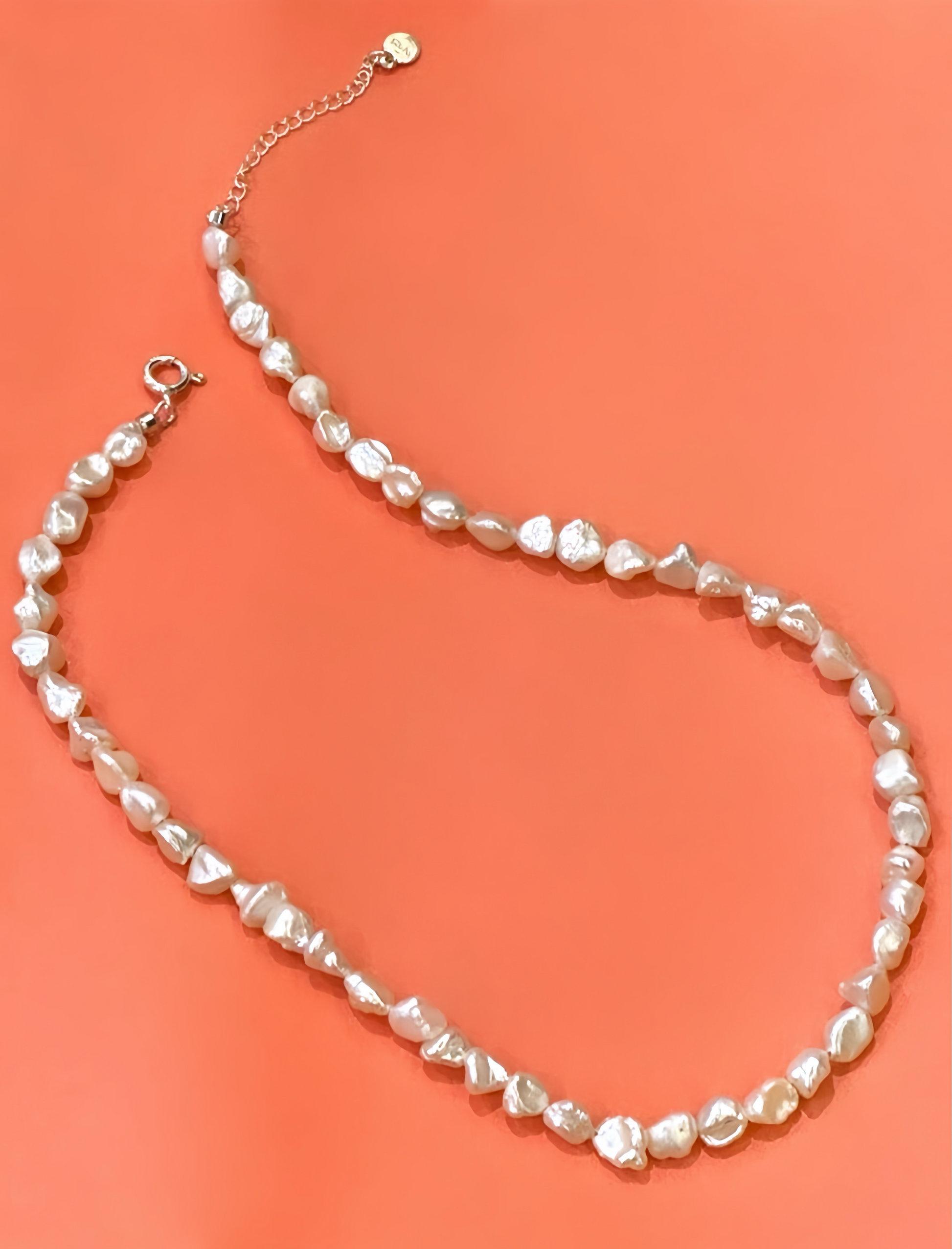 A handmade necklace crafted with irregularly shaped, “ugly” pearls for a unique look.