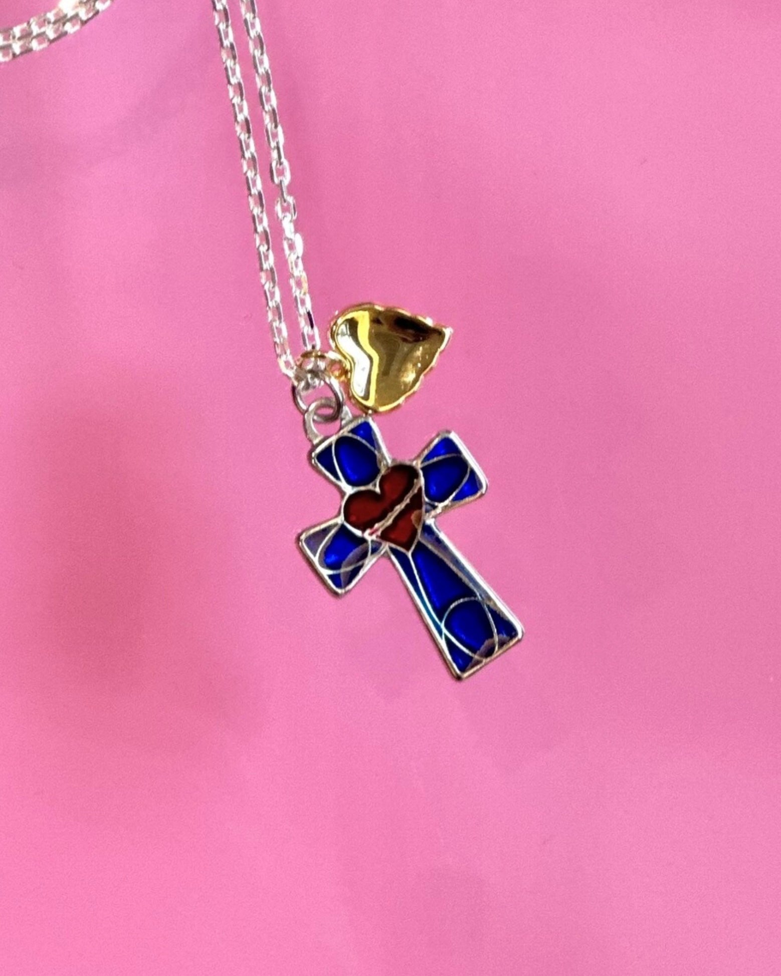 A necklace featuring a vintage cross pendant with a heart detail, layered with a mini heart pendant for added charm.